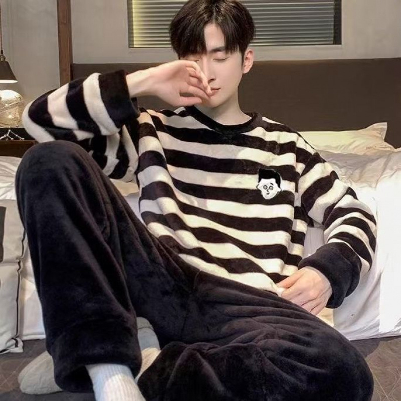 珊瑚绒睡衣男款秋冬季加绒加厚圆领套装法兰绒男生青少年家居服