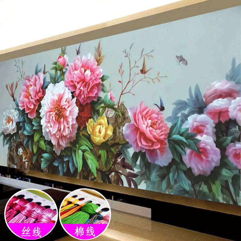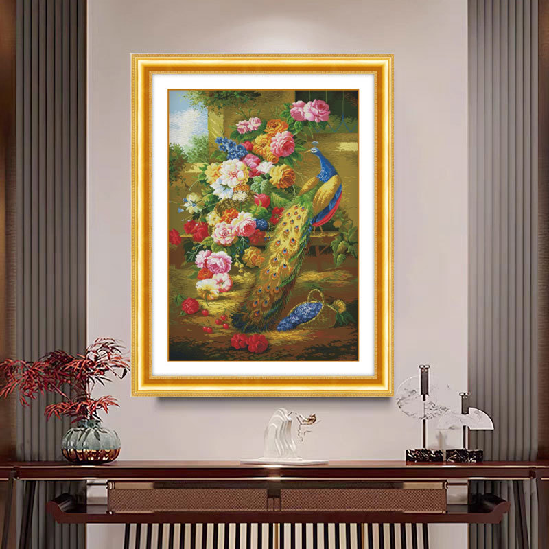 富貴栄華十字刺繍孔雀2025新型花開富貴牡丹花客間玄関縦版手作り糸刺繍