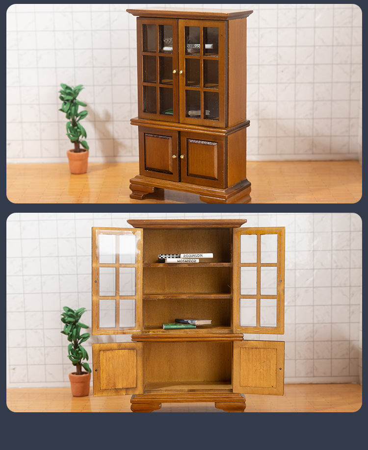 1:12dollhouse娃娃屋迷你家具微缩场景木质书柜模型栗色立式柜子