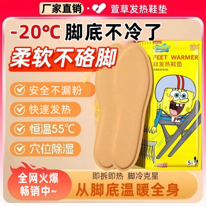 男性用ヒイラギ自己発熱インソール、スポンジボブ発熱フットウォーマー、全足用、歩行可能、使い捨て加熱インソール
