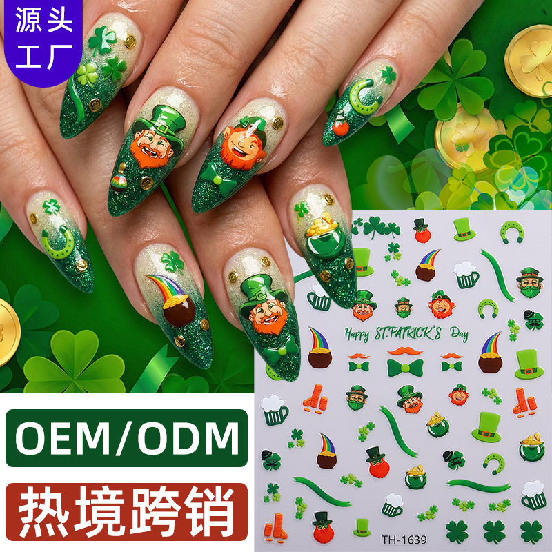 正祥跨境新款圣帕特里克节美甲贴纸DIY幸运四叶草INS风背胶指甲贴