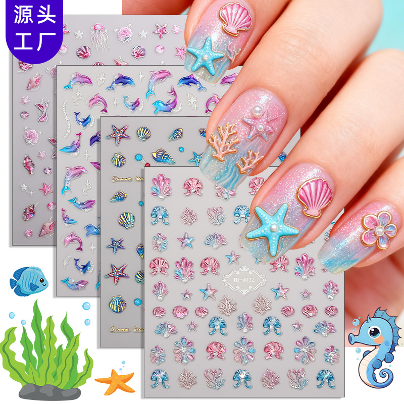 正祥夏日新款5D软胶美甲贴纸浮雕蝴蝶花朵海洋贝壳光仙女系指甲贴