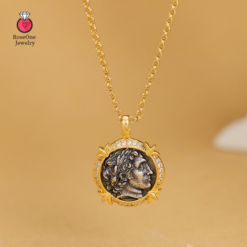 RoseOneの新しいスターリングシルバー太陽神古代コインネックレス、軽くて豪華なニッチ古代コインと金貨のセーターチェーン、レトロスタイル