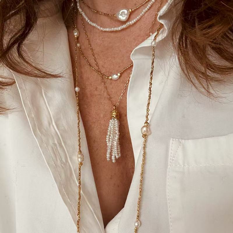 欧美ins珍珠太阳石麦穗流苏吊坠项链女法式轻奢天然石串珠毛衣链