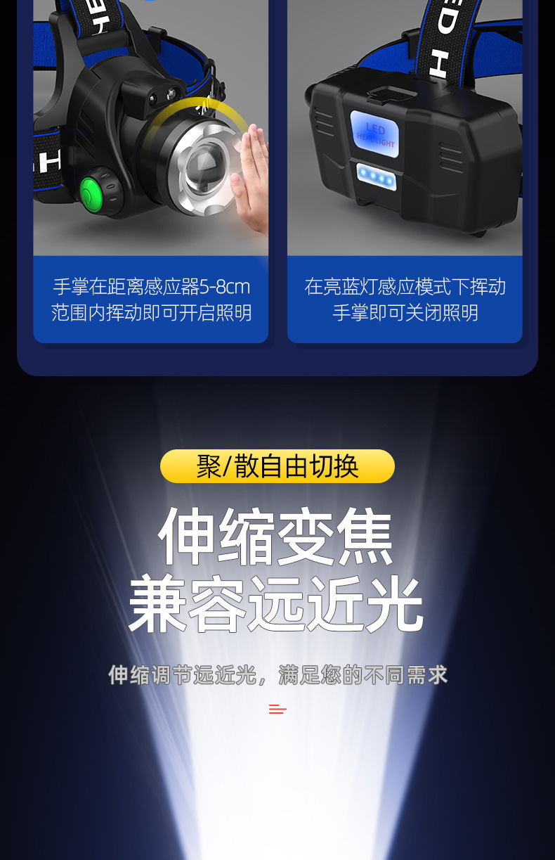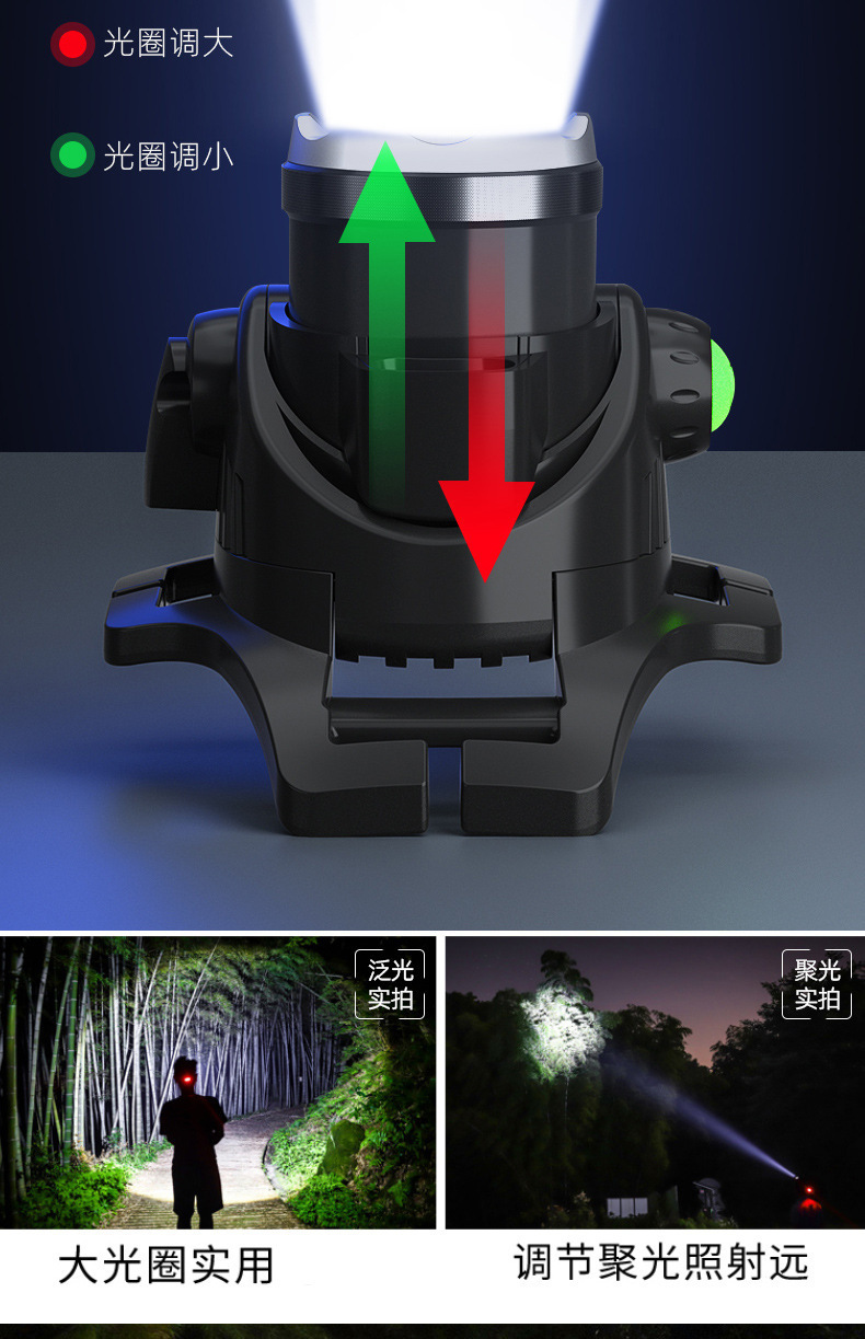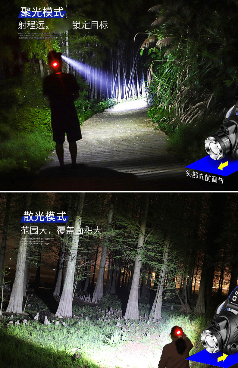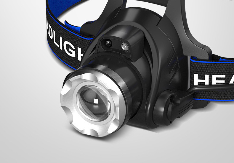 クロスボーダー屋外ズーム感応強い光ヘッドライト長い航続リチウム電気ヘッドマウント式爆亮ダブル光源釣りライト鉱山ライト