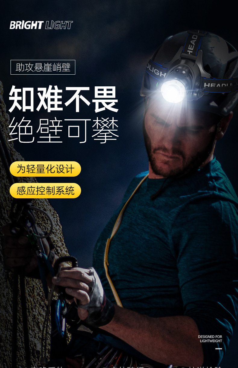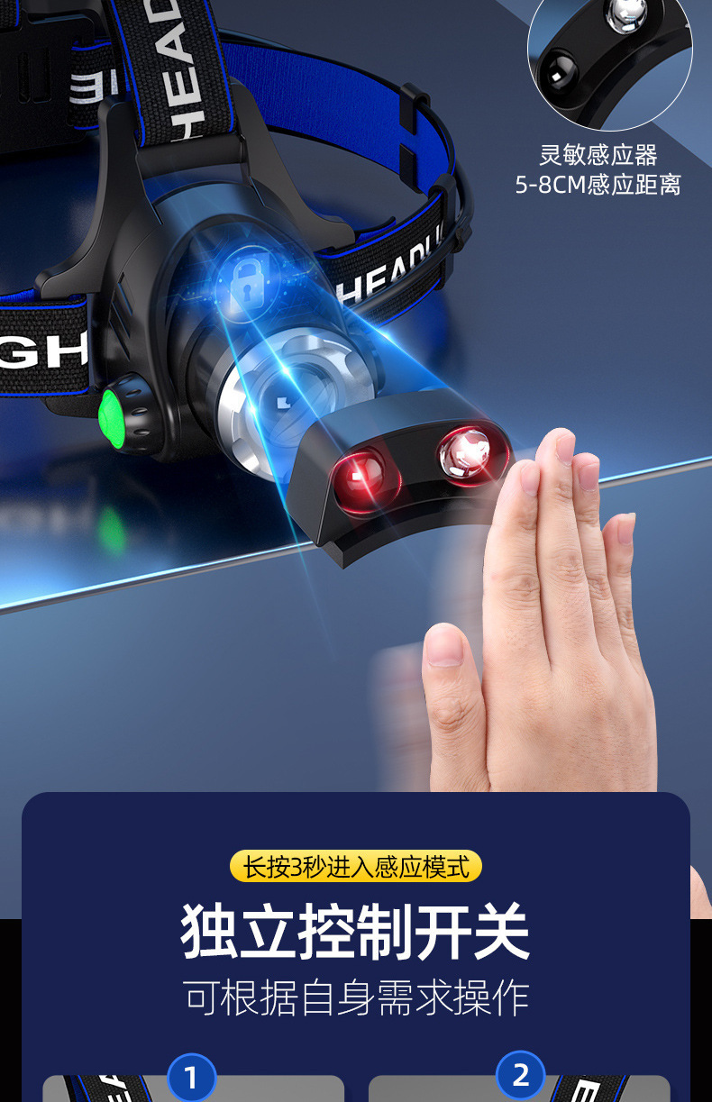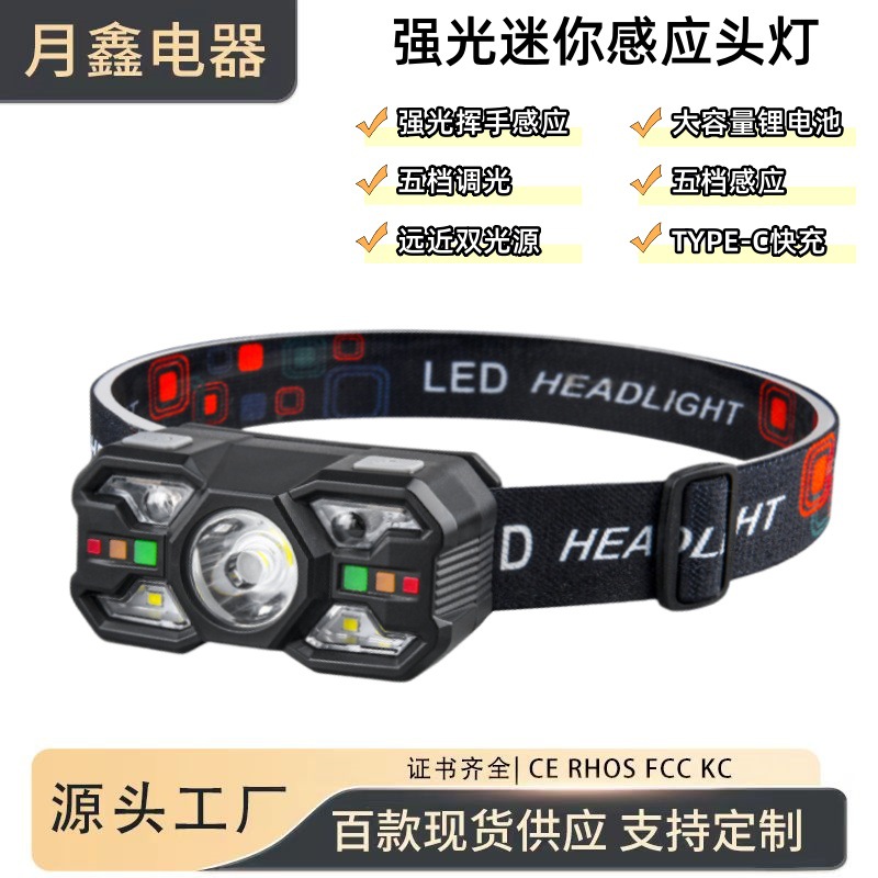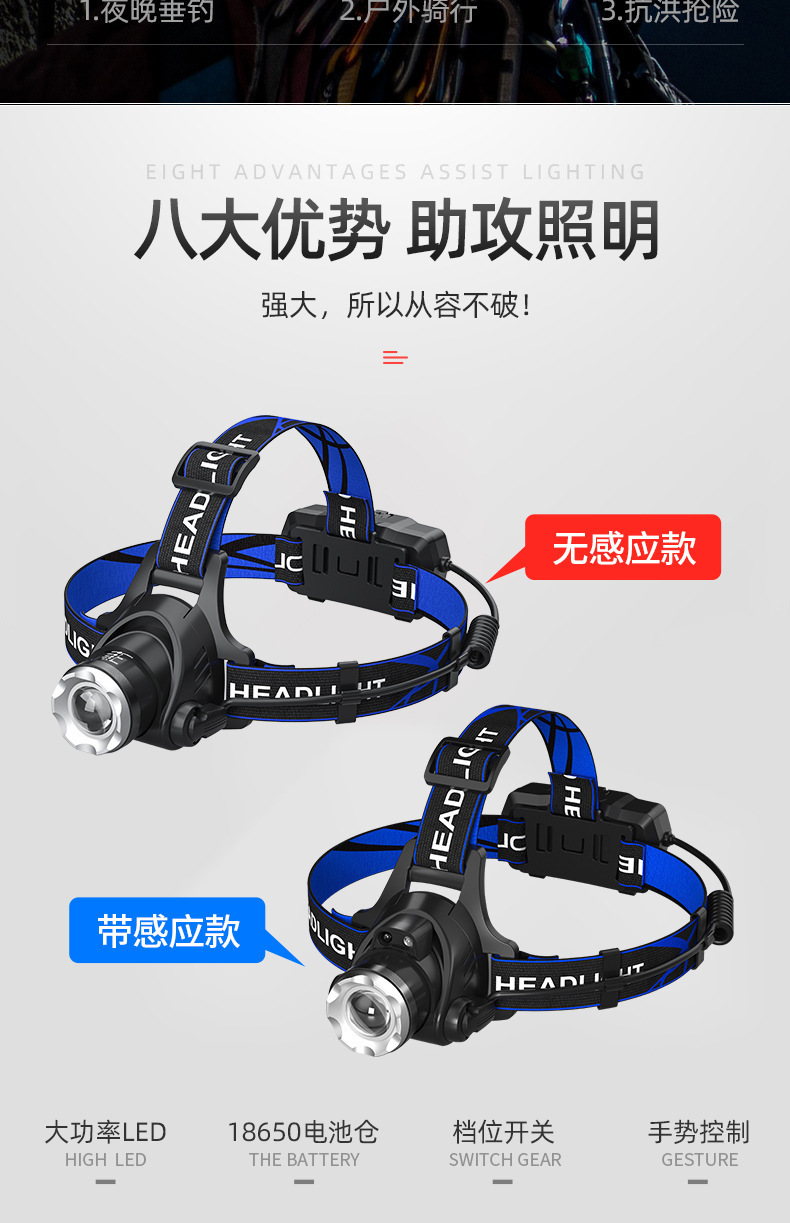 クロスボーダーアウトドア多機能方式強光知能感応ヘッドライト夜釣探洞双光源ヘッドセット