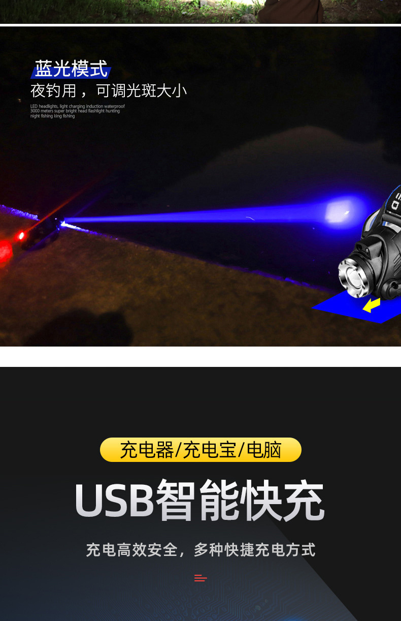 釣りヘッドライト充電ハイパワー屋外LED感応usbヘッド装着鉱灯キャンプ黄光紫光ブルーレイ赤色光