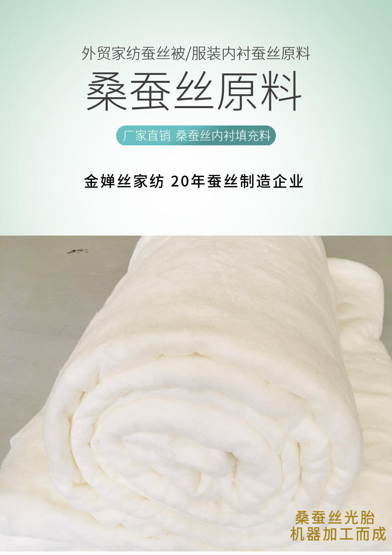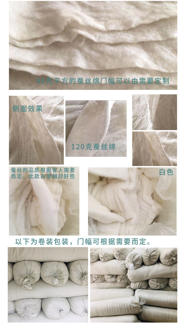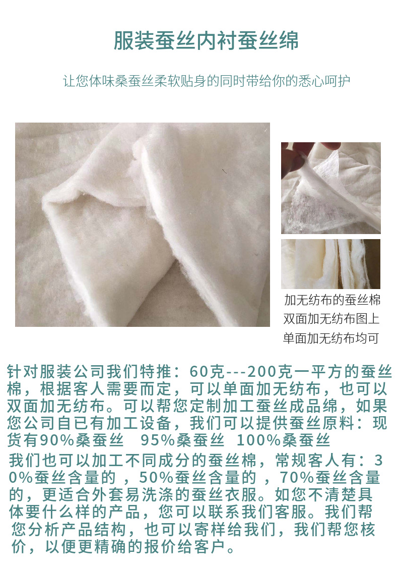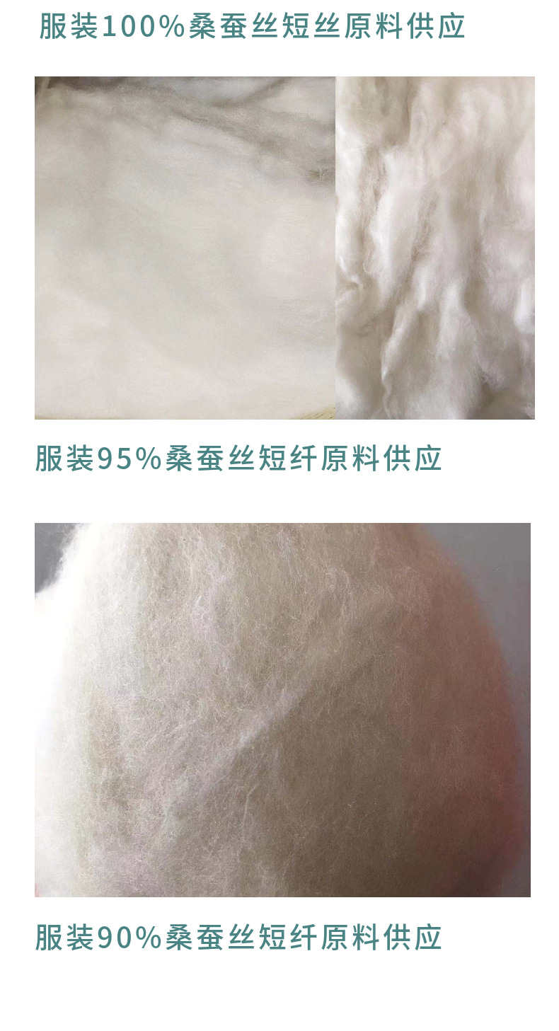 我厂是专业生产100%桑蚕丝绵,蚕丝短纤,真丝短纤的厂家,真丝蚕丝短纤原料分为《100%蚕丝含量的蚕丝短纤》《95%蚕丝含量的蚕丝短纤》《90%蚕丝含量的蚕丝短纤》均有现货供应,也可以根据客人需要的要求来定做,量大优惠。同时我公司可以为<<服装厂加工100%蚕丝桑蚕丝针刺棉,为家纺公司定做制作蚕丝被的蚕丝针刺棉,也可以根据您需要的含量和产品门幅为您公司定制,同时也可以寄样到您公司>>,同时并承揽加工桑蚕丝绵胎和桑蚕丝绵被业务。如有意合作请来电询