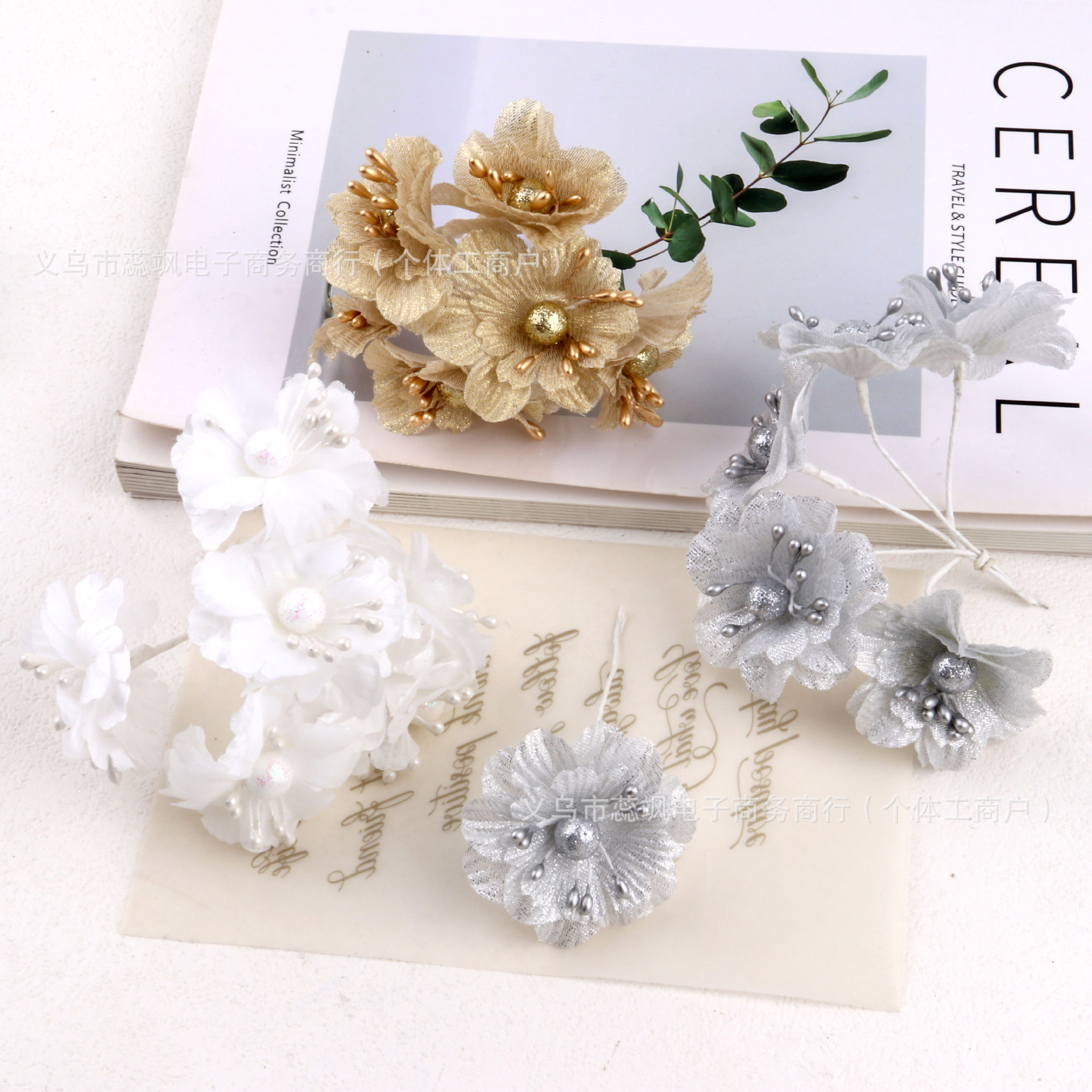 60本の装飾は布芸のツバキの花の黄金の銀色の高級なシミュレーションの造花のdiyの装飾の頭飾りの花輪の道具を模倣します。