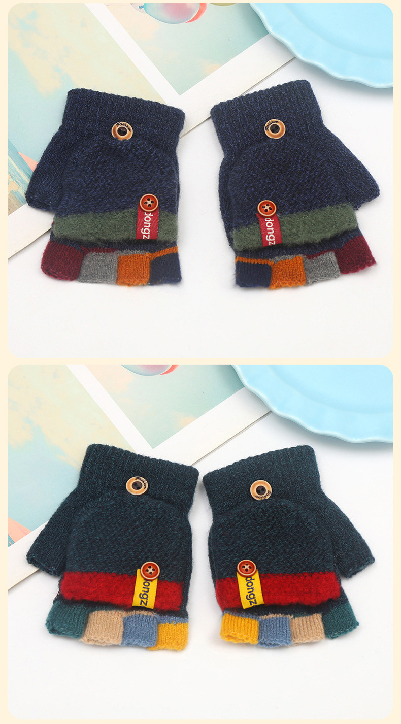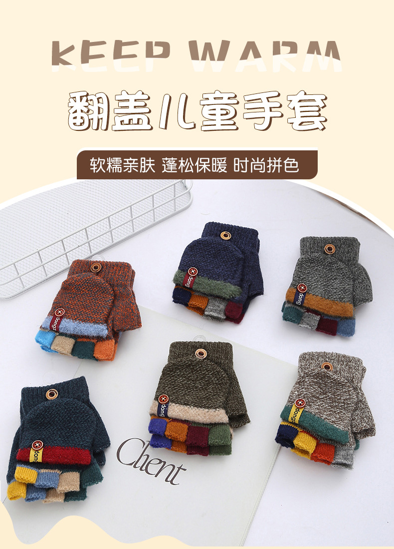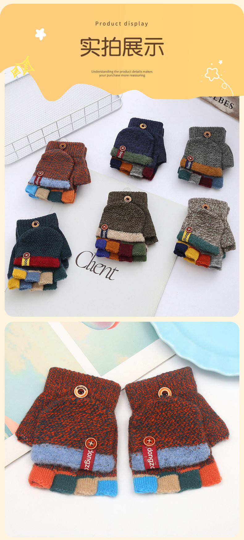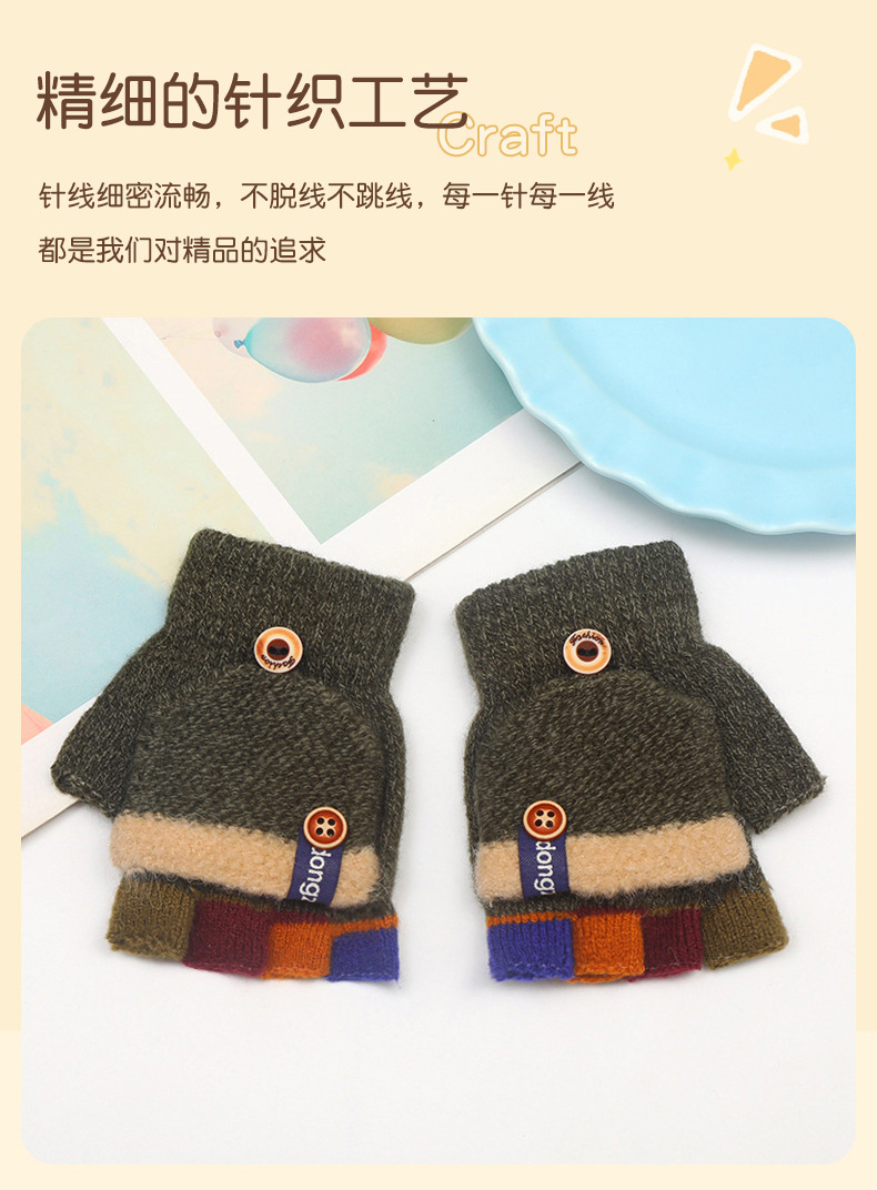 秋冬季儿童翻盖保暖手套婴儿可爱卡通半指防寒手套毛绒针织手套