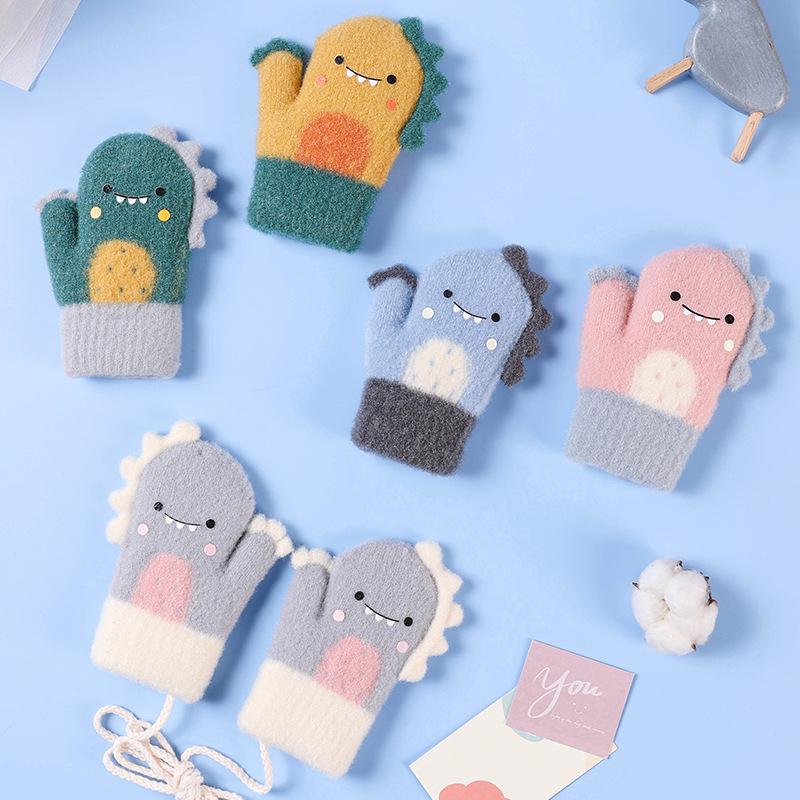 宝宝手套秋冬季男女童卡通恐龙防风保暖加厚半指小孩翻盖防寒分指