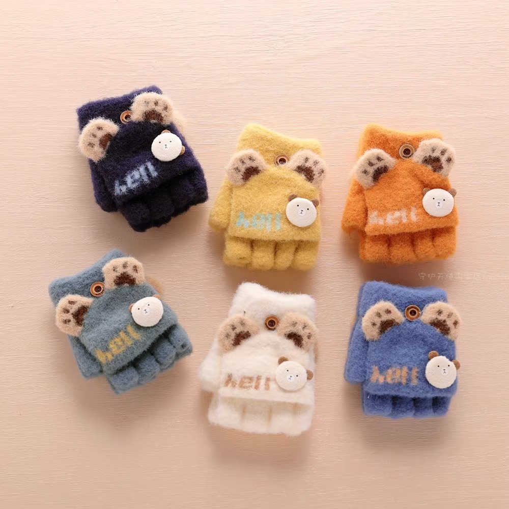 小熊半指手套秋冬季儿童保暖翻盖针织漏指手套宝宝卡通保暖手套