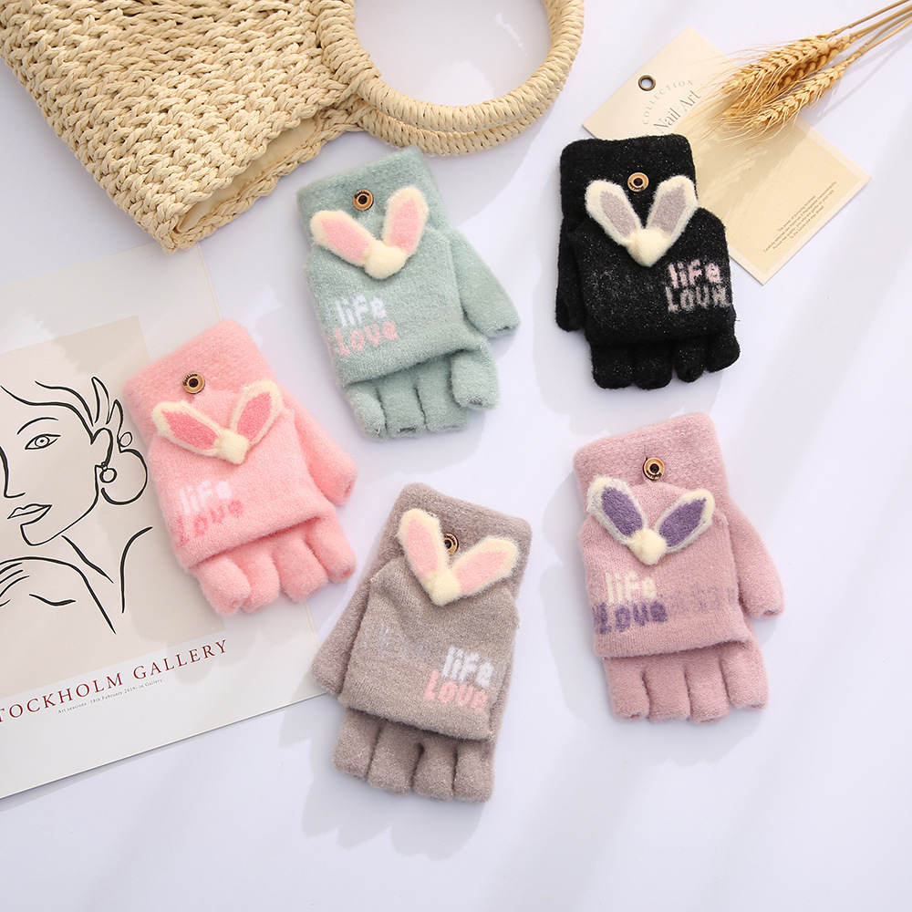新しい子供用手袋学生ライティングハーフフィンガーフリップ手袋クリスタル糸ウサギ学生手袋卸売