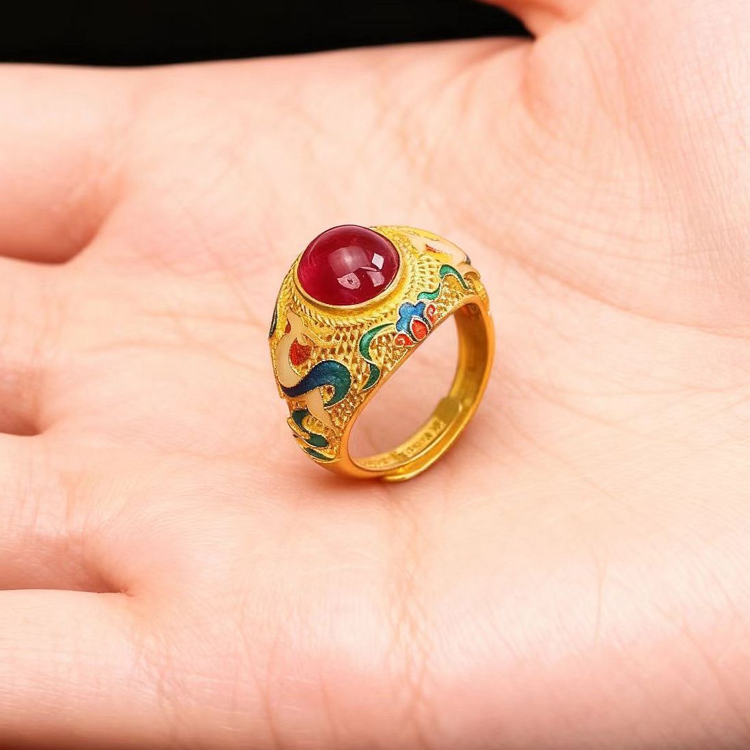 国潮情侣款烧蓝珐琅如意戒指越南沙金复古民族风珐琅男女对戒批发