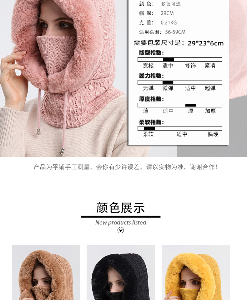 跨境新品连体毛球帽女护耳口罩围脖一体套头帽加绒针织毛线帽子冬