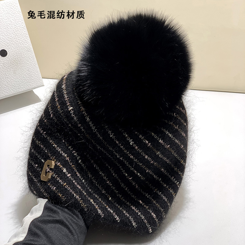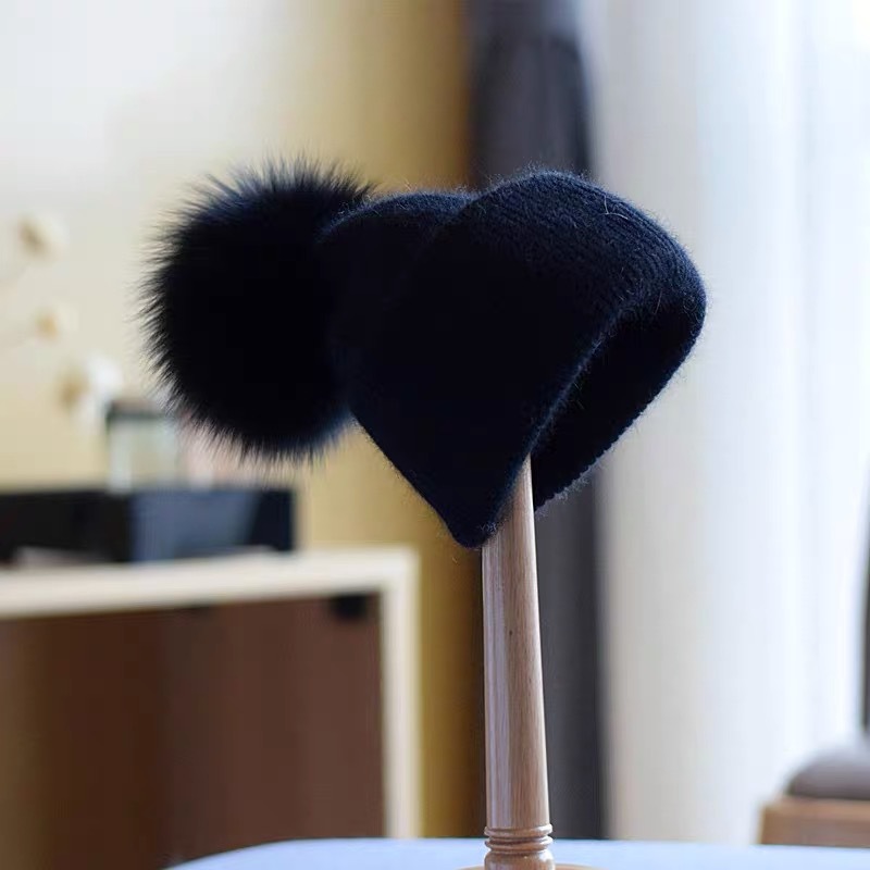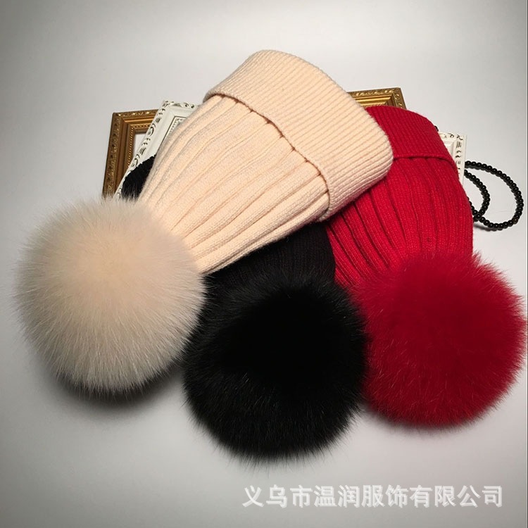 真狐狸毛球冬季保暖兔毛混纺针织帽女秋冬韩版百搭帽子护耳毛线帽