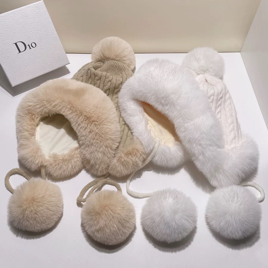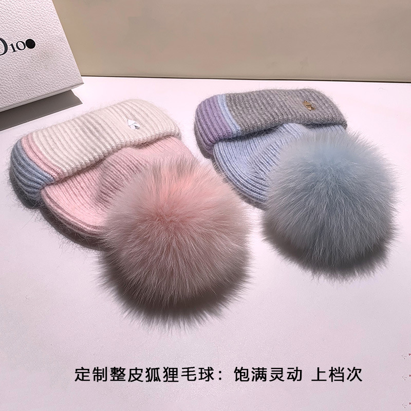 リアルフォックスファーボール冬暖かいウサギの毛皮ニット帽女性のための秋と冬の韓国スタイル多用途帽子耳保護ドームウール帽子