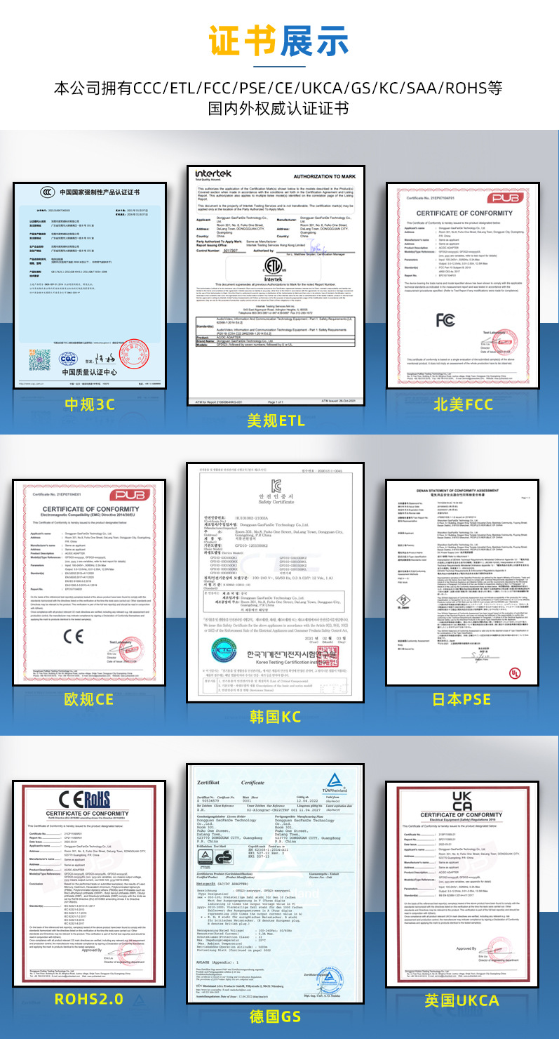 国家標準 CCC 認証,CQC認証,米国ETL/FCC認証,欧州CE/GS認証,韓国のKC/KCC認証,日本のPSE認証,英国規格 UKCA/CE 認証,オーストラリアの規制 SAA 認証,ロシアのEAC認証