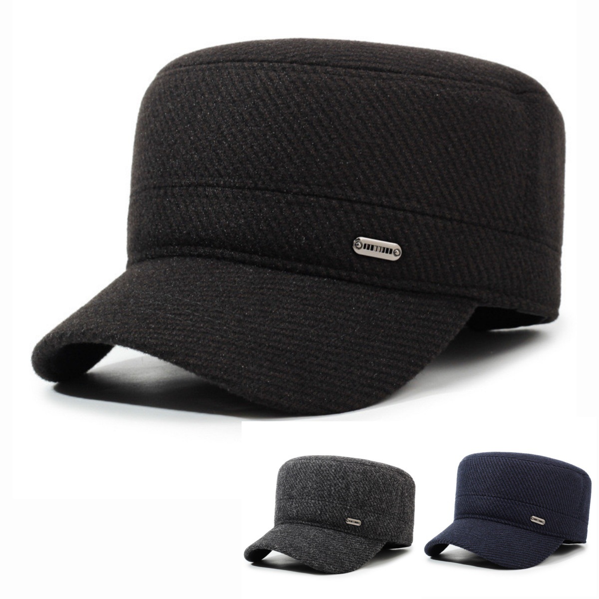 新款条纹呢平顶帽秋冬季加绒加厚护耳毛呢中老年棉帽户外男士帽子