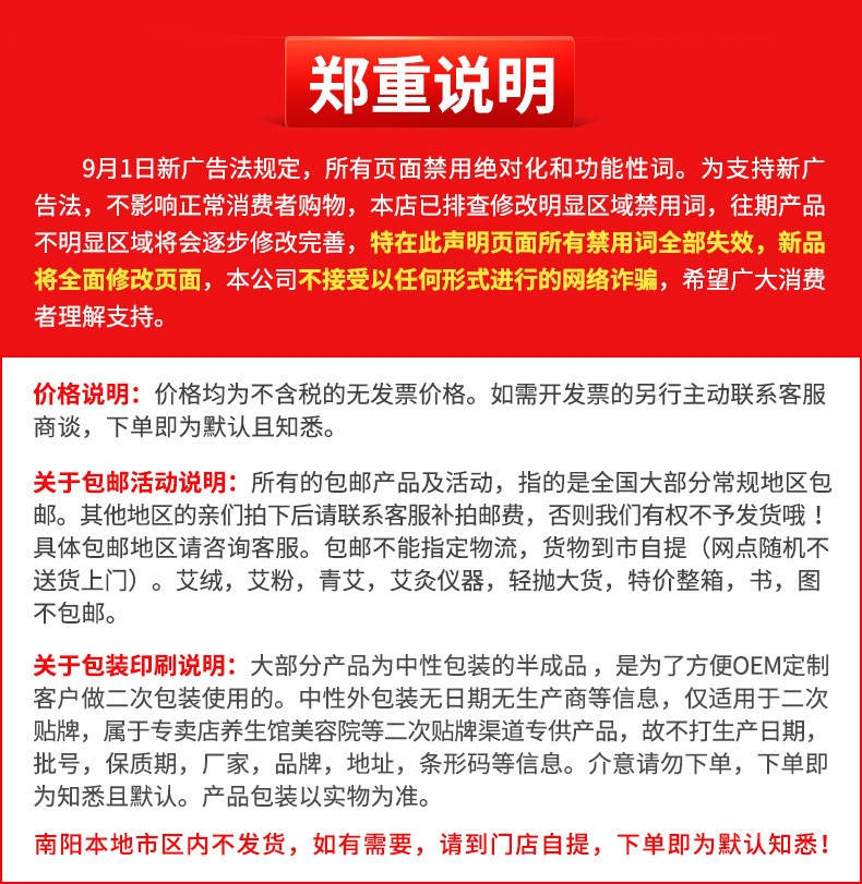 关于运费:因产品均有重量,快递和物流运输都是按重量结算,故一律不以下单后系统自动弹出的运费数字为准!所有运输费用均按照货物包裹总重量重新核算,下单后请自觉联系客服询问运费并多退少补,所有订单运费不够视为无效且我司有权不予以发货!敬请知悉且下单即为默认!