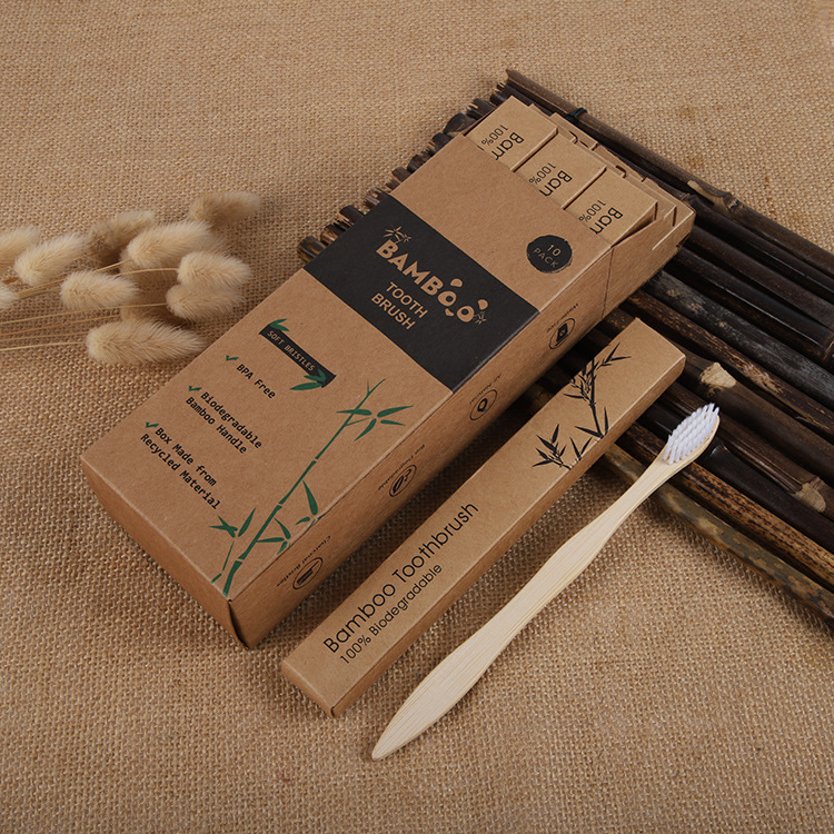 跨境酒店民宿竹制牙刷成人平板软毛竹可降解牛皮纸袋彩色软毛牙刷