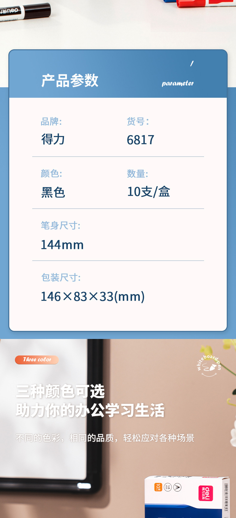 得力白板笔6817黑色可擦易擦黑板笔水性白板笔培训大头笔好写易擦