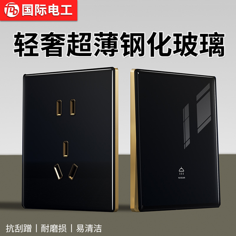 隠し86型超薄型黒色強化ガラススイッチコンセントパネル壁家庭用五穴電源コンセント卸売り