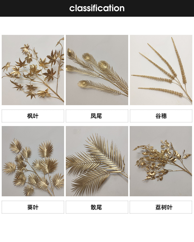 金色シリーズのシミュレーション植物卸売ユーカリの金持ち扇子イチョウの葉のカエデの葉の鳳尾の雪の花の結婚式の装飾