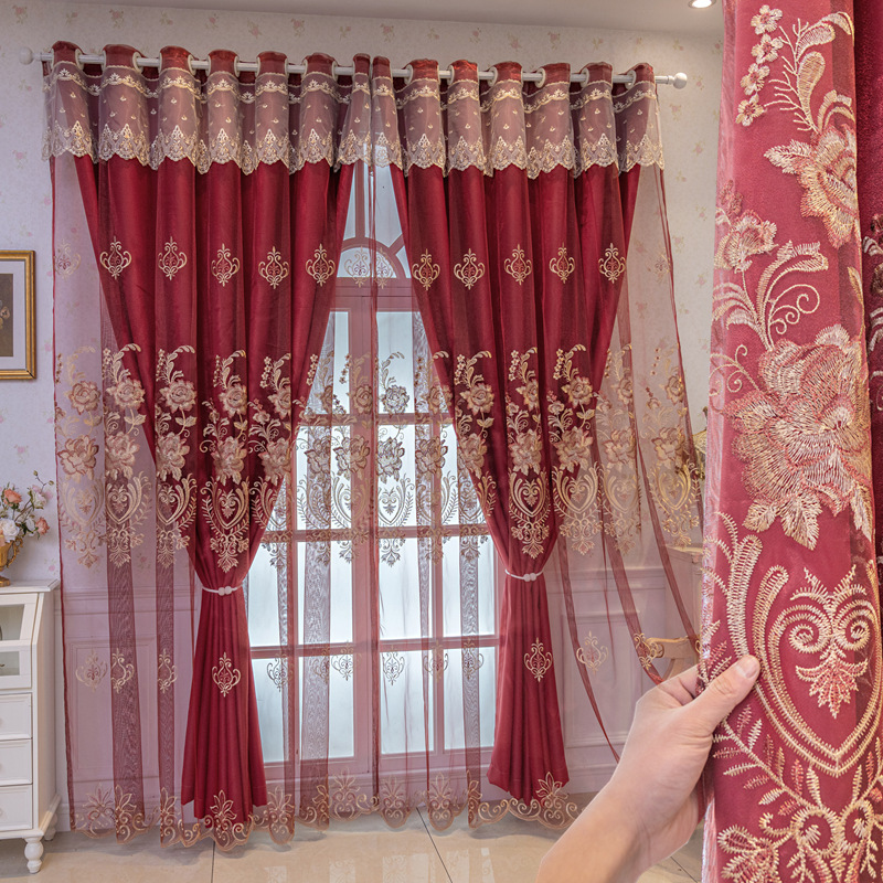 ヨーロッパの田園の刺繍のカーテンの二重の完成品は光を通さないで人の客間の寝室のベランダの二重の紗の一体の卸売りをします。