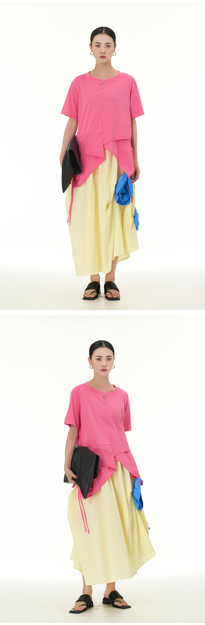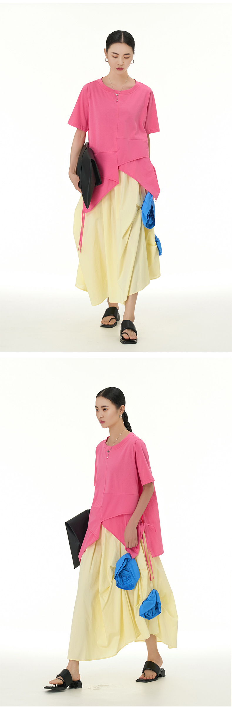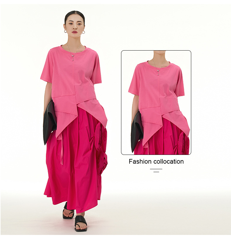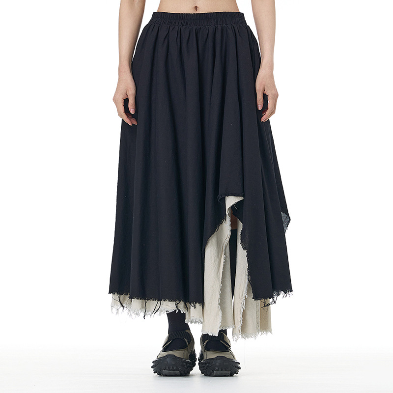 2025春の新型の大きいサイズの婦人服は不規則に色のデザインの半身のスカートにぶつかります。