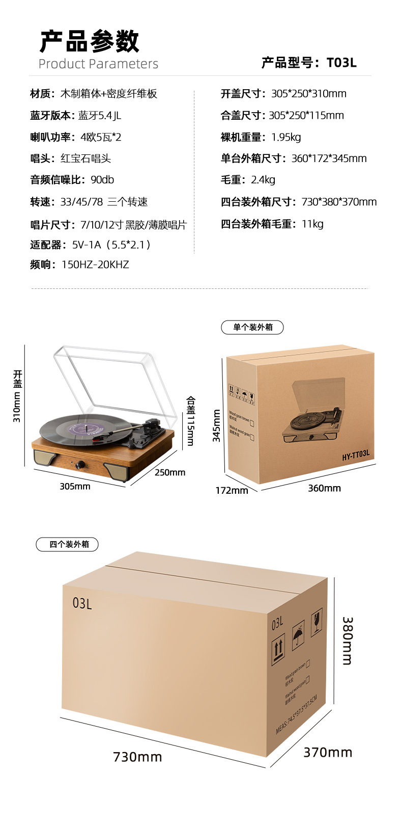 现货亚马逊爆款经典复古留声机蓝牙音响电唱机加防尘盖黑胶唱片机