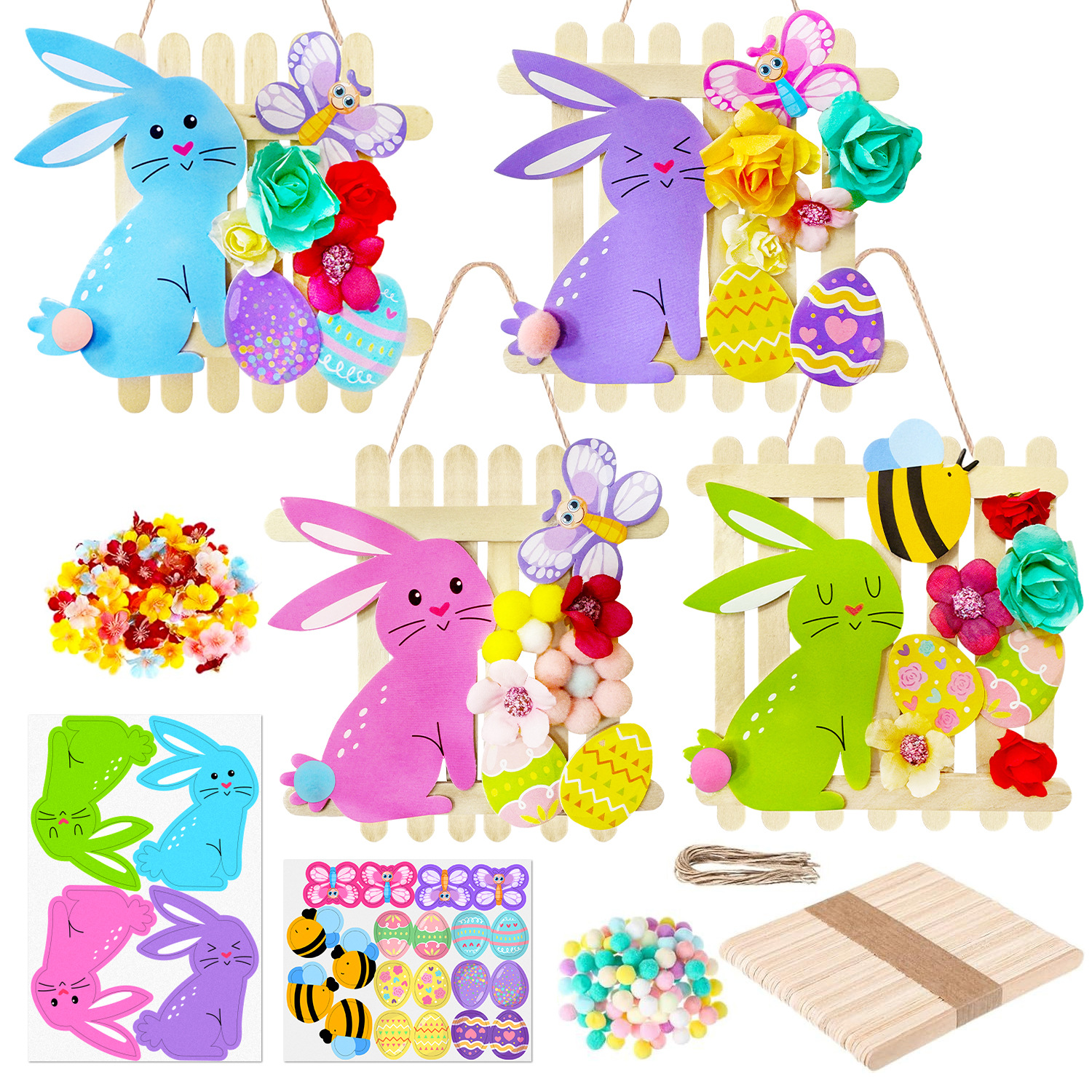 复活节工艺套装 DIY 木制兔子蛋蜜蜂蝴蝶饰品带人造花和棒子