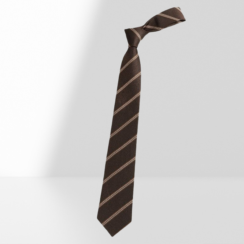 茶色のレトロなストライプのネクタイの女性は日本jk学院風の怠け者で、シャツのアクセサリーをしないでコーヒー色の手でネクタイをします。