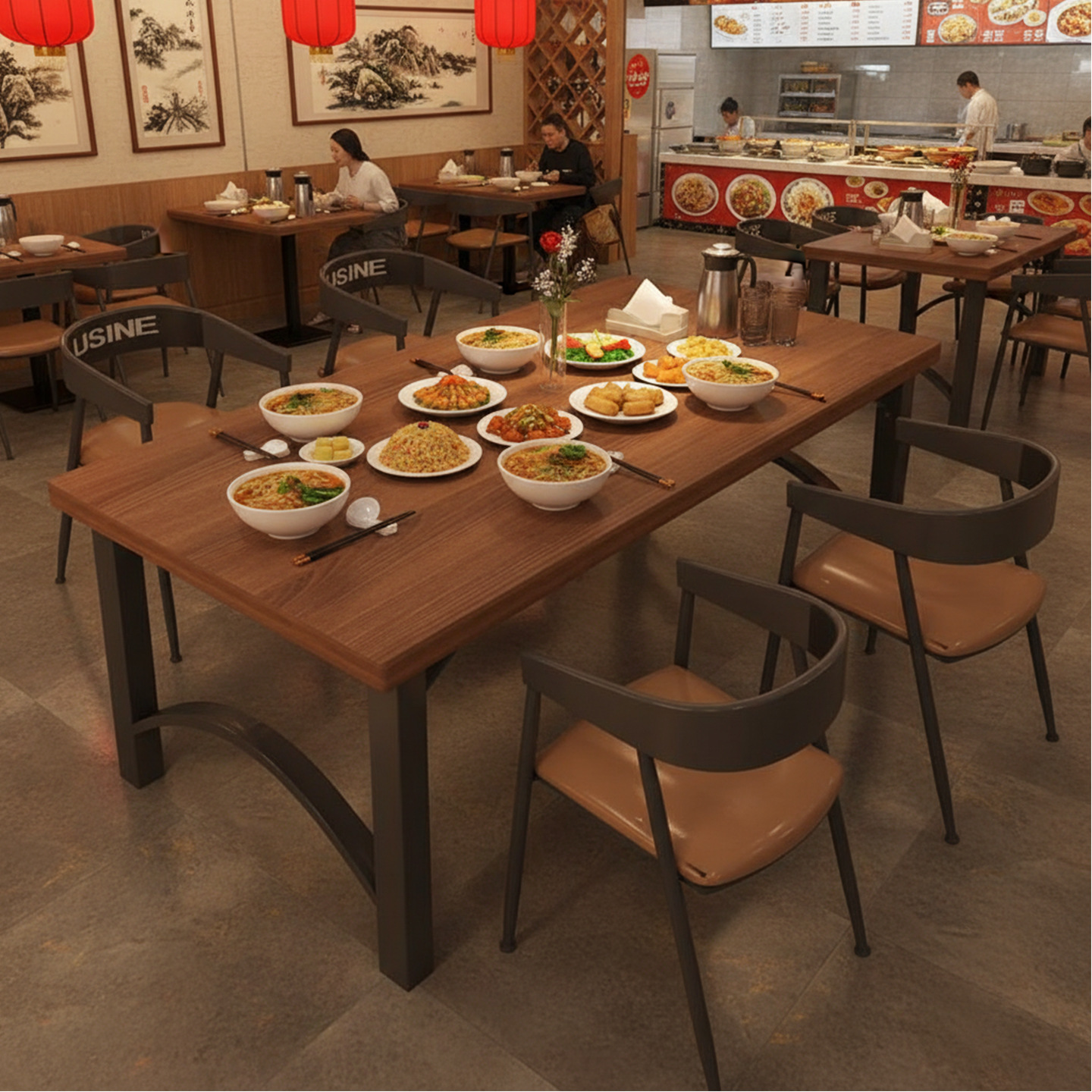 麺屋のテーブルと椅子 レストランのスナックバーのテーブルと椅子 ダイニングテーブルの組み合わせ 無垢材のレストランの食堂のテーブル レストランのバーベキュー炭化