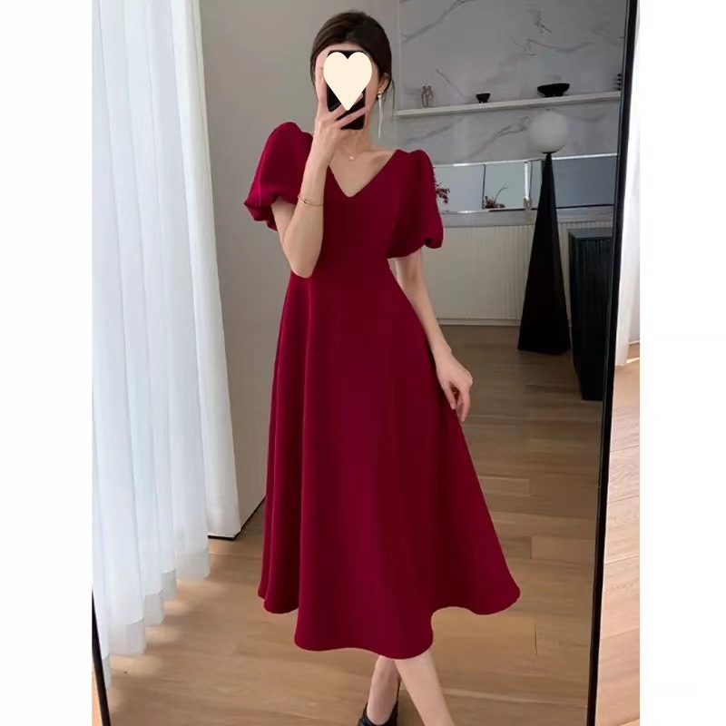大きいサイズの太った妹のフランスvネックのヘボン風のワインの赤いスカートの女性の夏の泡の袖はやせてお腹を隠しますロングスカート