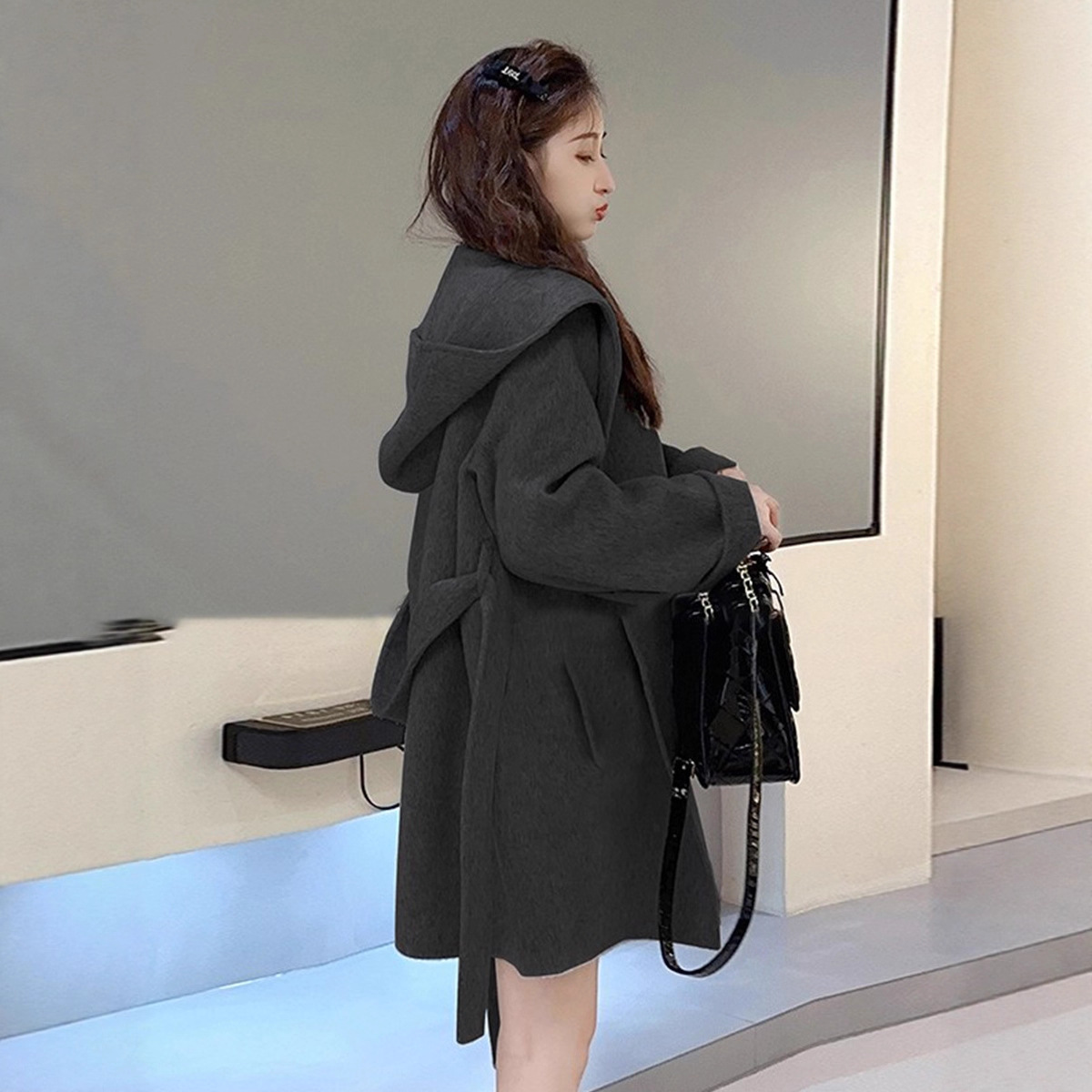 连帽时尚气质毛呢大衣女2025秋冬新款系带休闲宽松赫本风呢外套
