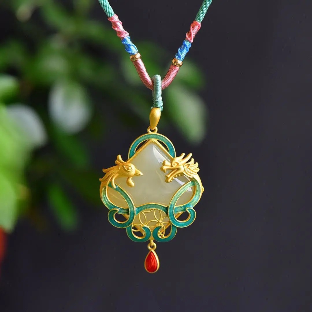 レトロ唐風国潮民族中国風白玉ペンダントメッキ18k金龍鳳呈祥エナメルカラーネックレス