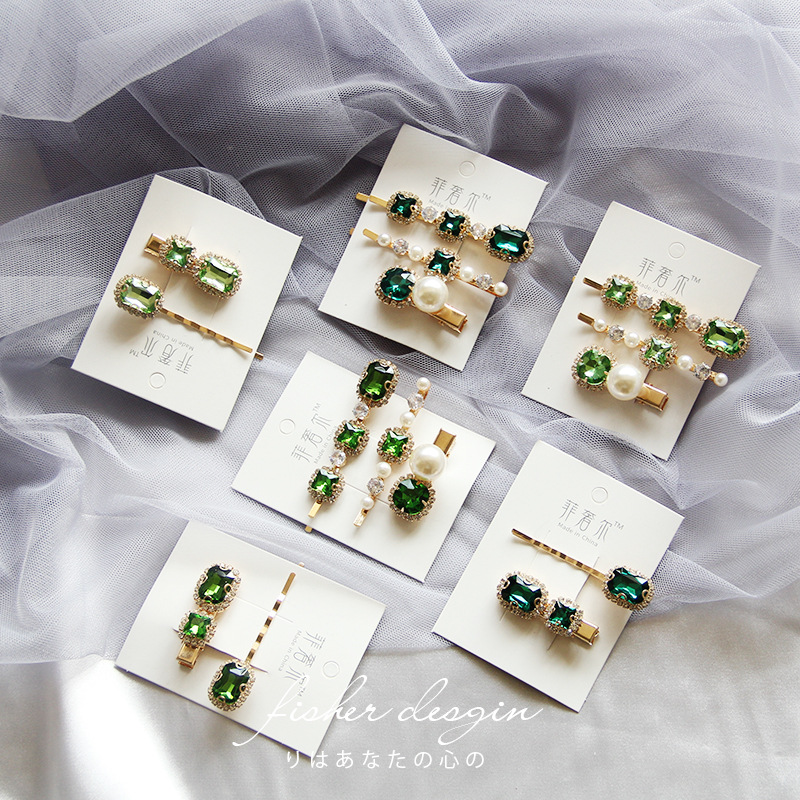 気質宮廷復古真珠緑水ドリル一字クリップ前髪サイドネットレッドクリップ金属サイドクリップ水晶髪飾り