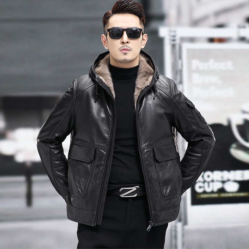 海寧真皮皮衣男性綿羊皮の短い帽子付きダウンジャケット革ジャケットカジュアル毛皮コート冬の流れ