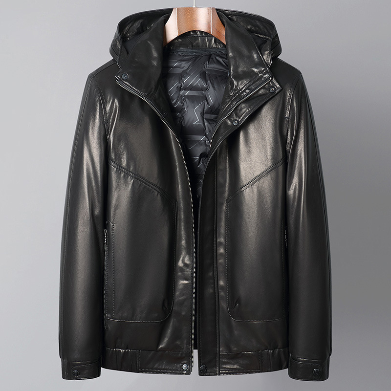 2025新型ダウンジャケットの男性本革の皮の服と帽子の短い革のジャケットの小さいヤギの皮のコートはカジュアルです。