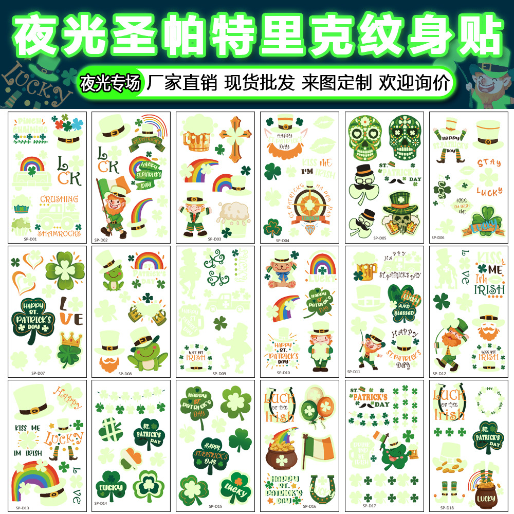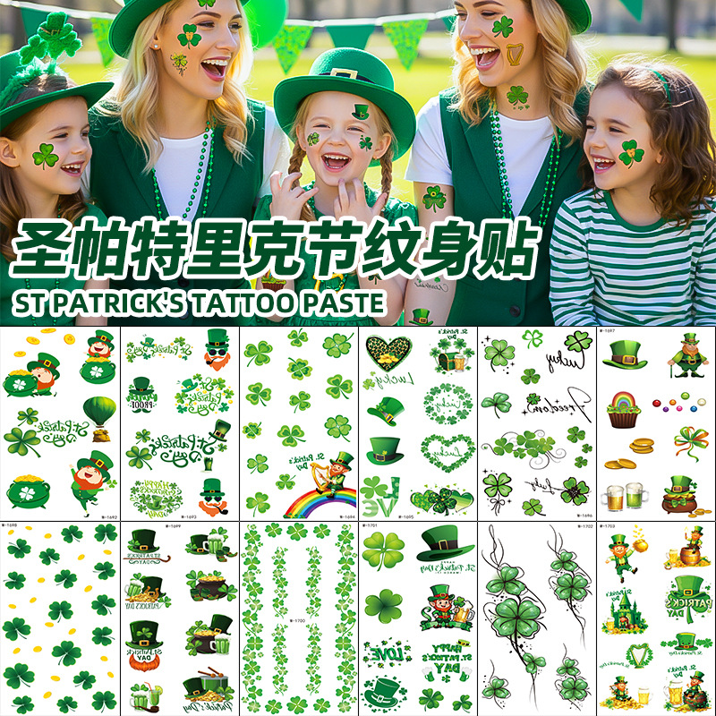 跨境圣帕特里克节纹身贴防水绿帽子三叶草妆容爱尔兰节脸贴Tattoo