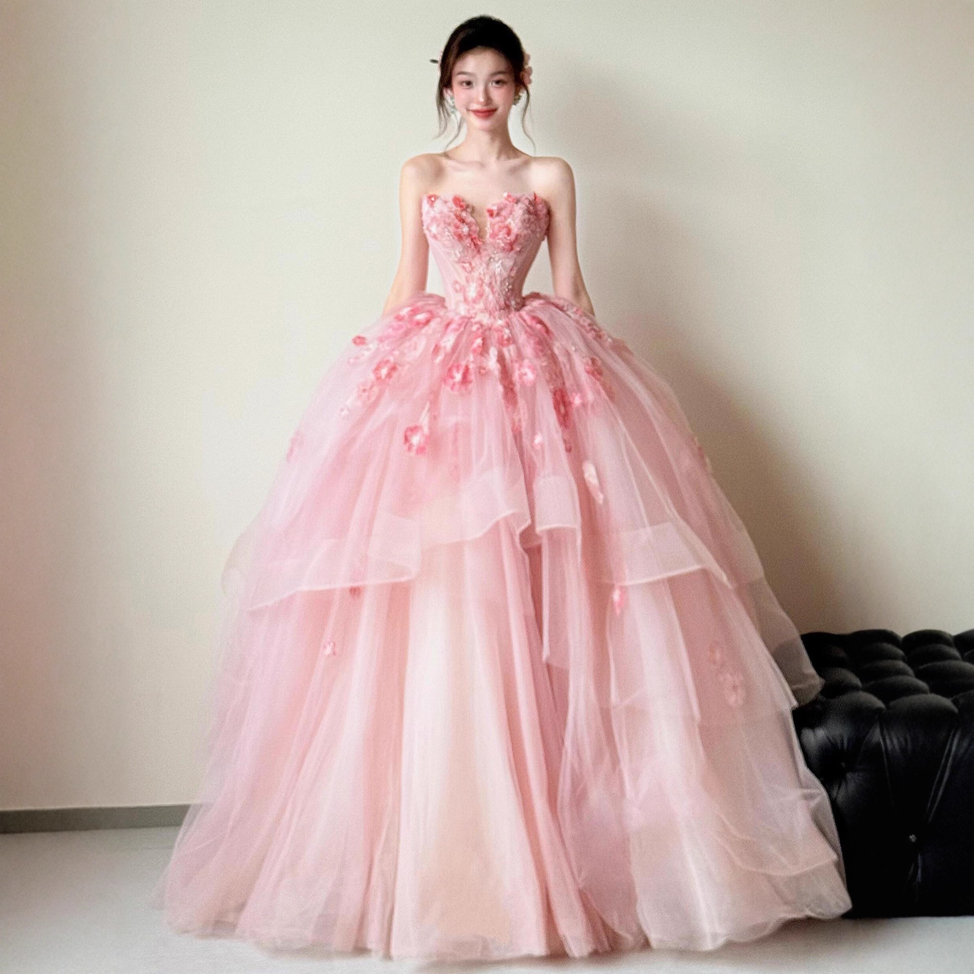 抹胸晚礼服裙女花朵粉色法式小众宴会生日派对新娘订婚结婚敬酒服