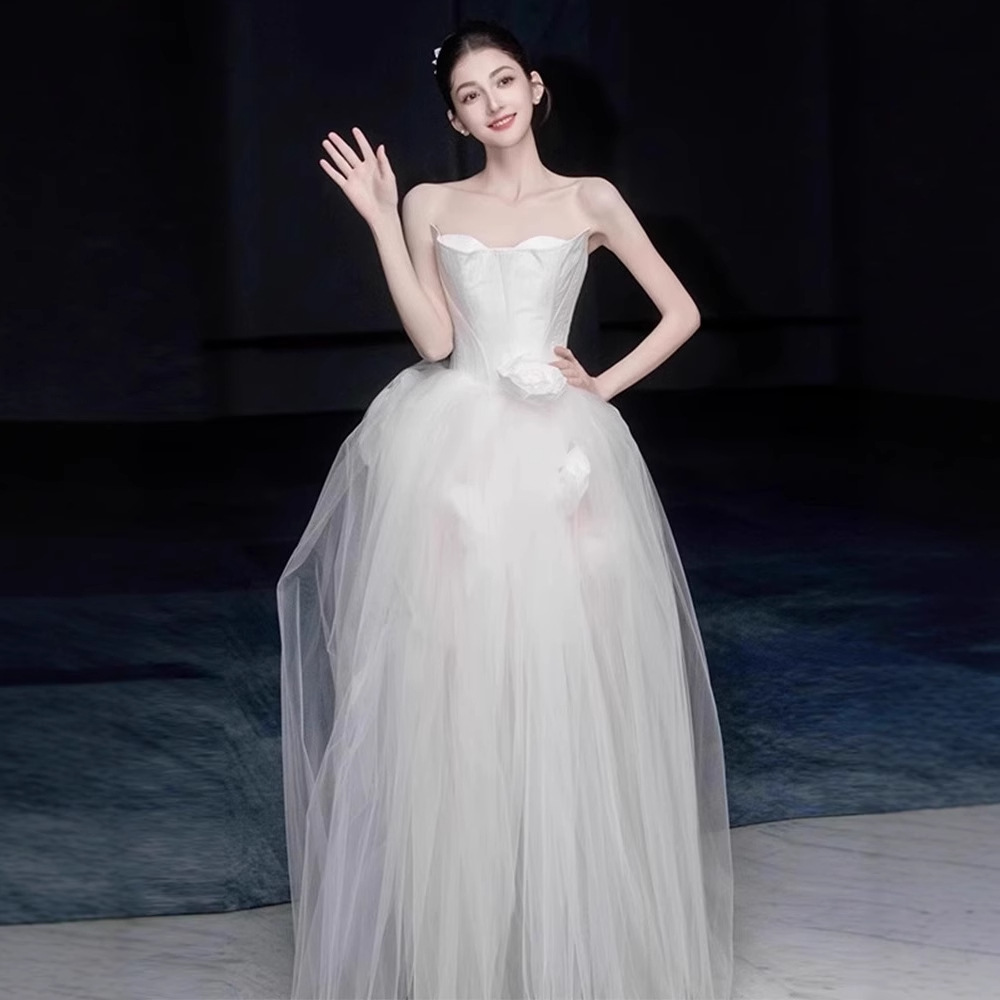 フランス式の胸の軽いウェディングドレス2025年の新型の婚約気質の花嫁の白い外出の紗のドレスの旅は客を迎えます。