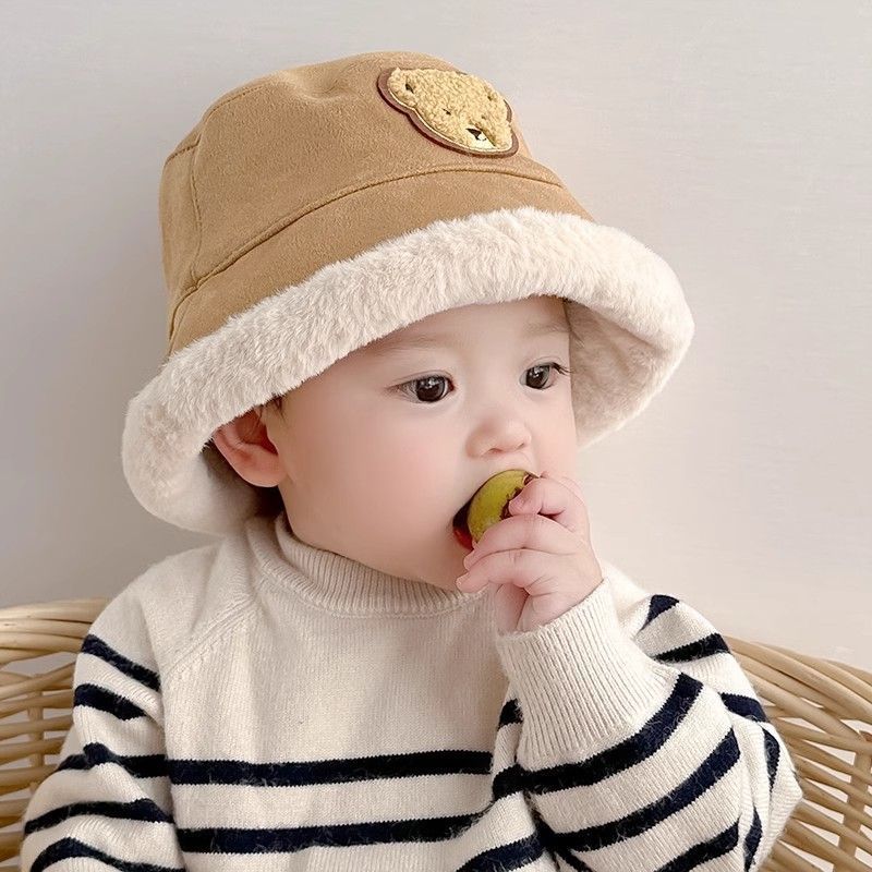 日系百搭网红款儿童麂皮绒盆帽冬毛绒保暖糯叽叽男女童小熊渔夫帽