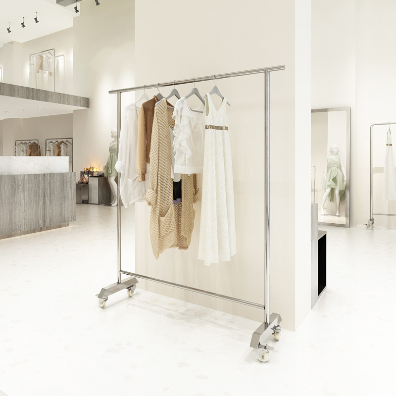 洋服店展示棚ステンレス床置き式棚銀輪付きハンガー婦人服店陳列中島棚