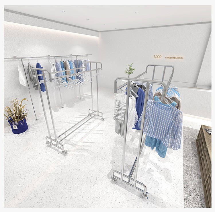 衣料品店のディスプレイラックシンプルなステンレス鋼の床置きディスプレイラック婦人服店の洋服ラック中島洋服ラック厚みのある