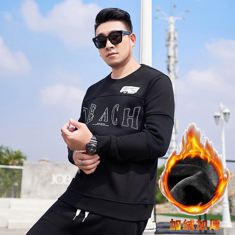 大码男装加绒加厚保暖字母卫衣宽松百搭上衣圆领长袖内搭打底衫男