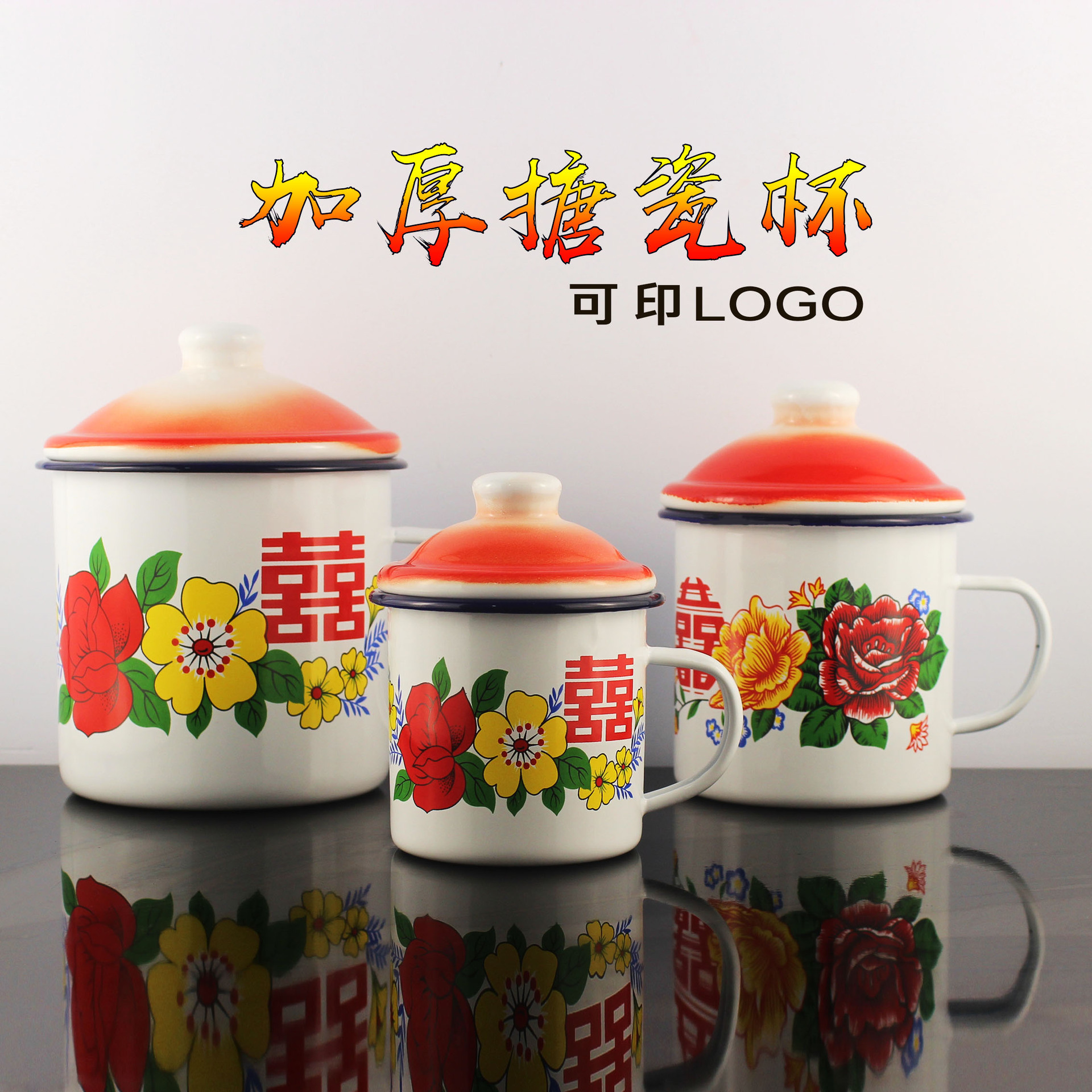 双喜花卉搪瓷杯带盖腰封婚庆喜宴礼品喜糖盒马克杯伴手礼茶缸子