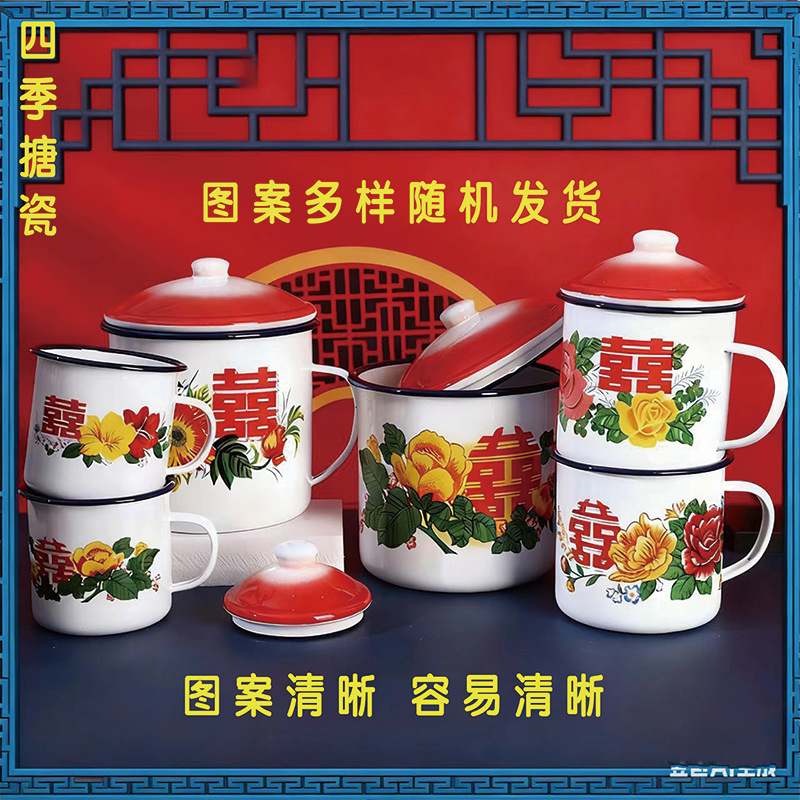 国潮エナメルカップマグカップレトロな双喜エナメルシリンダー喜礼喜糖箱花卉金エナメルカップ茶筒