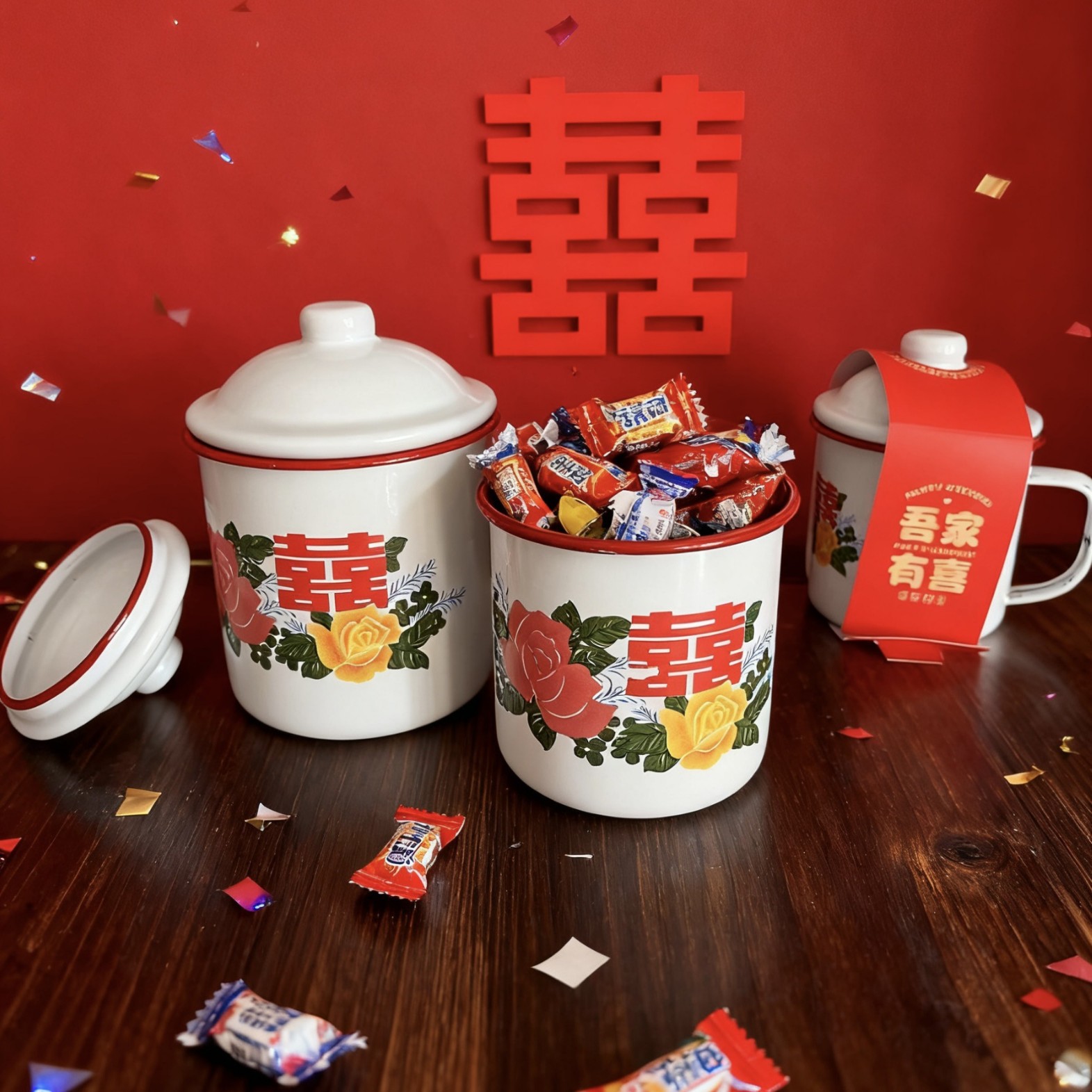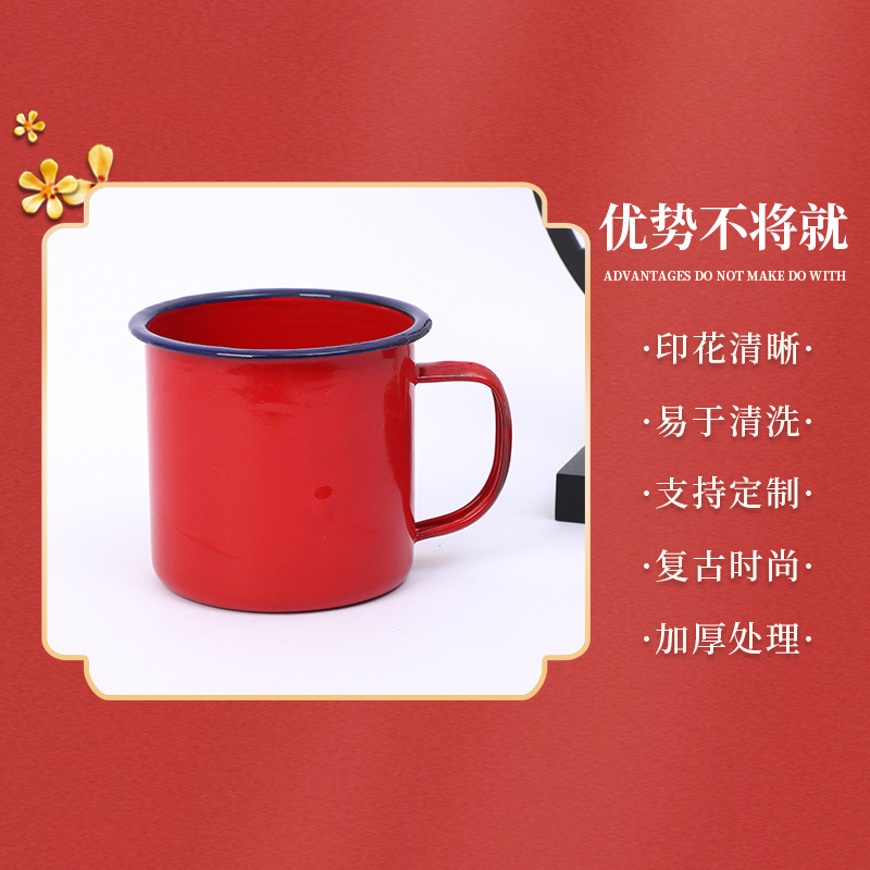新款双喜款搪瓷杯红边喜糖杯复古搪瓷喜糖盒搪瓷茶缸喜礼双喜糖杯